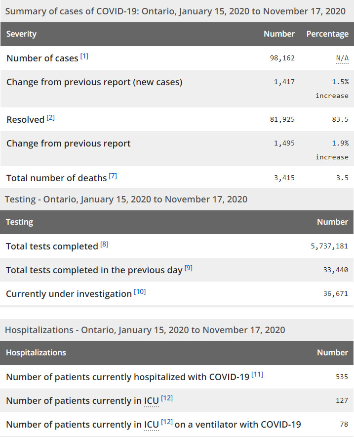 再看看安省方面的详细数据,截止11月17日,安省已对5,737,181例进行了新冠病毒检测(检测数较昨天新增33,440),还有36,671处于被调查阶段。确诊总数98,162(较昨天新增1417,确诊率下降为4.24%),包括81,925例康复(康复率上升为83.5%)、3415例死亡(较昨天增加32例,死亡率仍为3.5%)。住院患者535例(增加6);进入ICU患者127例(未变);IU插呼吸机患者78例(增加3)。
