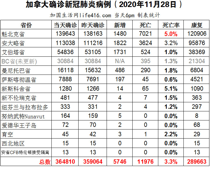 【加国生活网编译报道】截至11月28日下午6点,加拿大新冠确诊病例总数为364810(新增5746),死亡11976(新增82)。魁省确诊总数139643(新增1480);安省确诊总数113038(新增1822);艾省确诊总数54836(新增1731);BC省逢周末不更新;曼省确诊总数16118(新增486);萨省确诊总数7888(新增197)。加拿大新冠确诊率上升至3.1%;加拿大总理期望到2021年9月大多数加拿大人能接种上新冠疫苗;艾省新增1731例确诊病例,再创历史新高;安省新增1822例确诊病例,连续第二天超1800例;魁省死亡病例超过7千例达到又一严峻里程碑。加国生活网专门制作了如下统计数据表: