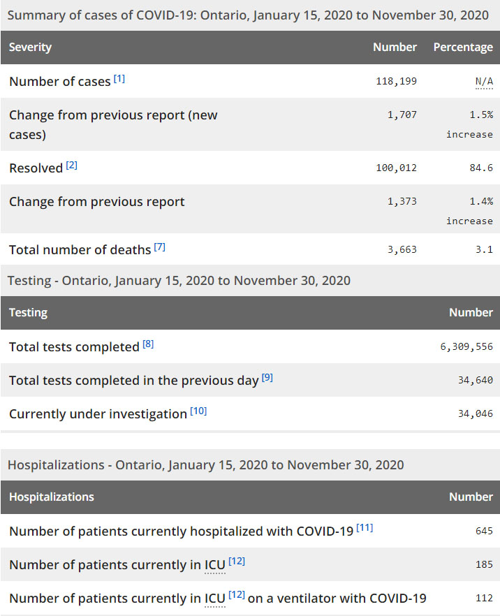再看看安省方面的详细数据,截止11月30日,安省已对6,309,556例进行了新冠病毒检测(检测数较昨天新增34,640),还有34,046处于被调查阶段。确诊总数118,199(较昨天新增1707,确诊率上升至4.93%),包括100,012例康复(康复率下降为84.6%)、3663例死亡(较昨天增加7例,死亡率仍为3.1%)。住院患者645例(增加27);进入ICU患者185例(增加17);IU插呼吸机患者112例(增加4)。