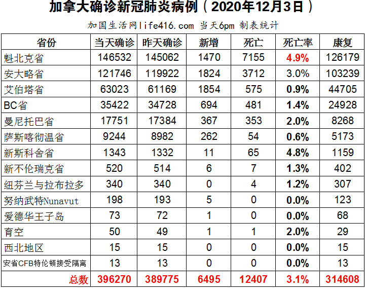 【加国生活网编译报道】截至12月3日下午6点,加拿大新冠确诊病例总数为396270(新增6495),死亡12407(新增82)。魁省确诊总数146532(新增1470);安省确诊总数121746(新增1824);艾省确诊总数63023(新增1854);BC省确诊总数35422(新增694);曼省确诊总数17751(新增367);萨省确诊总数9244(新增262)。加拿大联邦政府计划在未来几周内推出首批数百万剂新冠疫苗;艾省新增1854例确诊病例,“赶超”安省和魁省成为每天新增病例最高省份;安省当天新增1824例确诊病例,自疫情以来第三次超过1800例,重症监护患者的数量早于预期时达到了关键阈值150。加国生活网专门制作了如下统计数据表: