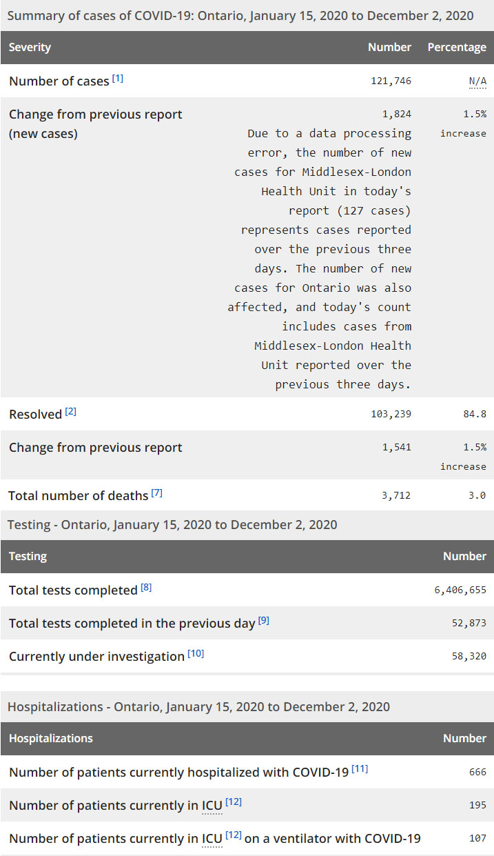 再看看安省方面的详细数据,截止12月2日,安省已对6,406,655例进行了新冠病毒检测(检测数较昨天新增52,873),还有58,320处于被调查阶段。确诊总数121,746(较昨天新增1824,确诊率下降至3.45%。由于Middlesex-London区漏报了127例过去三天的病例,致使安省的新增病例数也受到影响,1824例中包括了Middlesex-London区过去三天漏报的127例),包括103,239例康复(康复率仍为84.8%)、3712例死亡(较昨天增加14例,死亡率下降为3%)。住院患者666例(增加10);进入ICU患者195例(增加12);IU插呼吸机患者107例(增加1)。