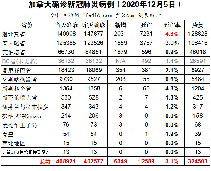 【加国生活网编译报道】截至12月5日下午6点,加拿大新冠确诊病例总数为408921(新增6349),死亡12589(新增93)。魁省确诊总数149908(新增2031);安省确诊总数125385(新增1859);艾省确诊总数66730(新增1879);BC省逢周末不更新;曼省确诊总数18423(新增354);萨省确诊总数9730(新增203)。加拿大新冠阳性确诊率上升至3.3%;艾省新增1879例确诊病例,是进入12月以来第二次创自疫情以来的最高纪录;魁省新增2031例确诊病例,是自“第二波”疫情以来首次超过2千;安省新增1859例确诊病例,是进入12月以来首次创历史新高。加国生活网专门制作了如下统计数据表: