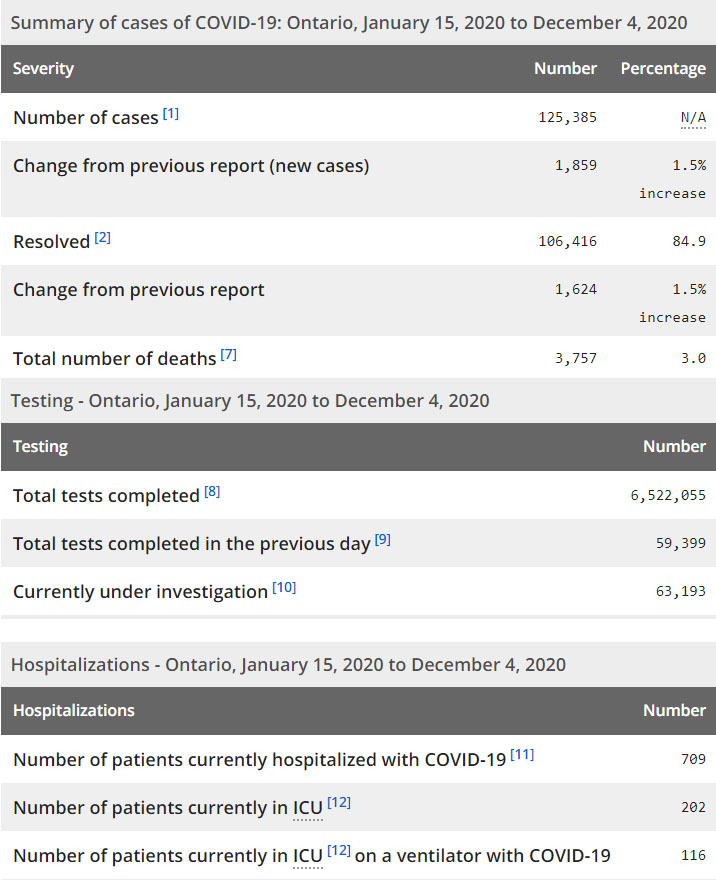 再看看安省方面的详细数据,截止12月4日,安省已对6,522,055例进行了新冠病毒检测(检测数较昨天新增59,399),还有63,193处于被调查阶段。确诊总数125,385(较昨天新增1859,确诊率下降至3.13%),包括106,416例康复(康复率上升为84.9%)、3757例死亡(较昨天增加20例,死亡率仍为3%)。住院患者709例(增加35);进入ICU患者202例(减少5);IU插呼吸机患者116例(未变)。