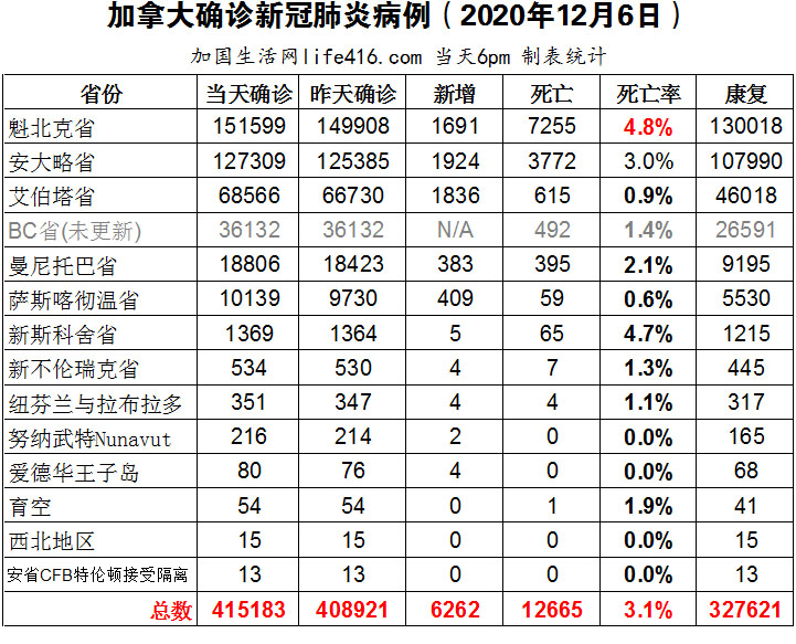 【加国生活网编译报道】截至12月6日下午6点,加拿大新冠确诊病例总数为415183(新增6262),死亡12665(新增76)。魁省确诊总数151599(新增1691);安省确诊总数127309(新增1924);艾省确诊总数68566(新增1836);BC省逢周末不更新;曼省确诊总数18806(新增383);萨省确诊总数10139(新增409)。安省新增1924例确诊病例,进入12月以来连续第二次创自疫情以来的最高纪录,且首次超过1900例;爱德华王子岛新冠确诊病例急剧增加,省长发布最新公共卫生措施;辉瑞疫苗一经加拿大监管机构批准,24小时内就可运到加拿大。加国生活网专门制作了如下统计数据表: