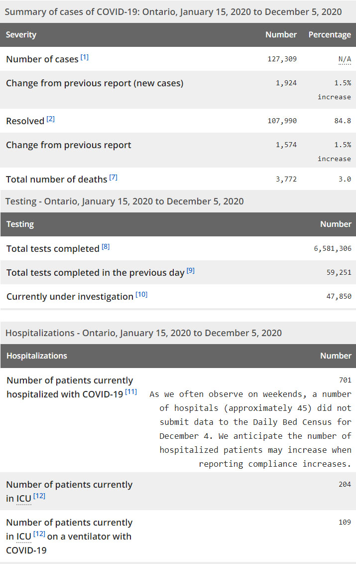 再看看安省方面的详细数据,截止12月5日,安省已对6,581,306例进行了新冠病毒检测(检测数较昨天新增59,251),还有47,850处于被调查阶段。确诊总数127,309(较昨天新增1924,确诊率上升至3.25%),包括107,990例康复(康复率下降为84.8%)、3772例死亡(较昨天增加15例,死亡率仍为3%)。住院患者701例(减少8);进入ICU患者204例(增加2);IU插呼吸机患者109例(减少7)。