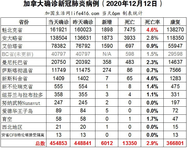 【加国生活网编译报道】截至12月12日下午6点,加拿大新冠确诊病例总数为454853(新增6012),死亡13350(新增99)。魁省确诊总数161921(新增1898);安省确诊总数138504(新增1873);艾省确诊总数78382(新增1590);BC省逢周末不更新;曼省确诊总数20750(新增358);萨省确诊总数11749(新增274)。专家警告称有了疫苗并不意味生活将很快恢复正常,卫生限制措施还不能停止;加拿大卫生部警告对疫苗过敏的人都不应接种辉瑞疫苗;安省再创测试量新高65,300。加国生活网专门制作了如下统计数据表: