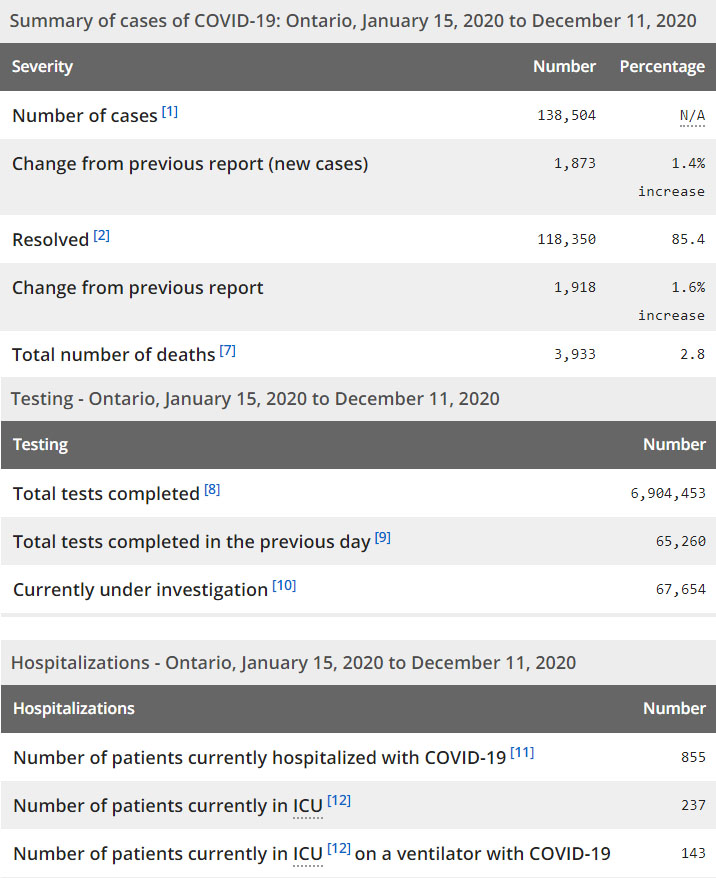 再看看安省方面的详细数据,截止12月11日,安省已对6,904,453例进行了新冠病毒检测(检测数较昨天新增65,260),还有67,654处于被调查阶段。确诊总数138,504(较昨天新增1873,确诊率下降至2.87%),包括118,350例康复(康复率上升为85.4%)、3933例死亡(较昨天增加17例,死亡率下降为2.8%)。住院患者855例(增加47);进入ICU患者237例(增加2);IU插呼吸机患者143例(增加16)。