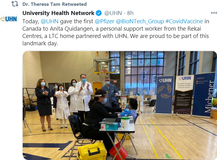 —— 加拿大历史上规模最大的疫苗接种运动从2020年12月14日星期一正式开始了,来自多伦多Rekai中心的护理人员Anita Quidangen接种了加拿大首批辉瑞疫苗的第一针。接种完成后,现场响起了热烈的掌声,这一场景成为加拿大抗击新冠疫情的一个重要里程碑。