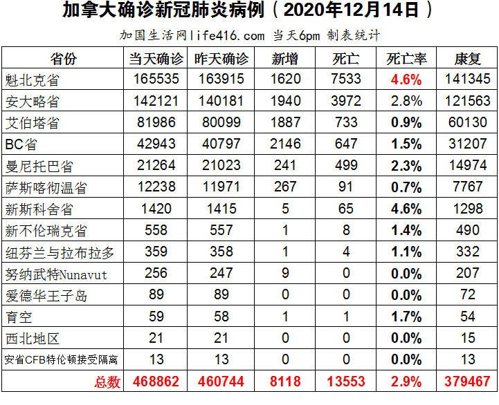 【加国生活网编译报道】截至12月14日下午6点,加拿大新冠确诊病例总数为468862(周末新增8118,当天新增6731),死亡13553(新增122)。魁省确诊总数165535(新增1620);安省确诊总数142121(新增1940);艾省确诊总数81986(新增1887);BC省确诊总数42943(周末新增2146,当天新增759);曼省确诊总数21264(新增241);萨省确诊总数12238(新增267)。加拿大历史上规模最大的疫苗接种运动从12月14日正式开始,第一针新冠疫苗开打,成为加拿大抗击新冠疫情的一个重要里程碑!有关新冠疫苗的Q/A问答。加国生活网专门制作了如下统计数据表: