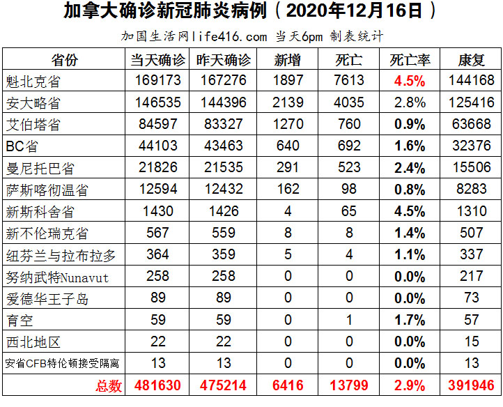 【加国生活网编译报道】截至12月16日下午6点,加拿大新冠确诊病例总数为481630(新增6416),死亡13799(新增140)。魁省确诊总数169173(新增1897);安省确诊总数146535(新增2139);艾省确诊总数84597(新增1270);BC省确诊总数44103(新增640);曼省确诊总数21826(新增291);萨省确诊总数12594(新增162)。加拿大公共卫生局预计面向普通民众的疫苗接种运动将于明年4月开始;艾省新冠死亡总数为760人,已经超过了过去10年的流感死亡总数;安省新增2139例确诊病例,连续第二天超过2千例,其中多伦多新增780例,创自疫情以来的单日最高纪录,也使多伦多的新冠确诊总数达到了5万“里程碑”。加国生活网专门制作了如下统计数据表: