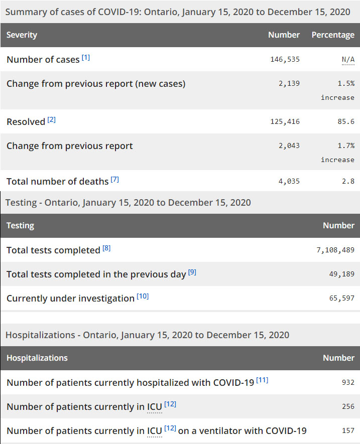 再看看安省方面的详细数据,截止12月15日,安省已对7,108,489例进行了新冠病毒检测(检测数较昨天新增49,189),还有65,597处于被调查阶段。确诊总数146,535(较昨天新增2139,确诊率下降至4.35%),包括125,416例康复(康复率上升为85.6%)、4035例死亡(较昨天增加43例,死亡率仍为2.8%)。住院患者932例(增加11);进入ICU患者256例(增加7);IU插呼吸机患者157例(增加1)。