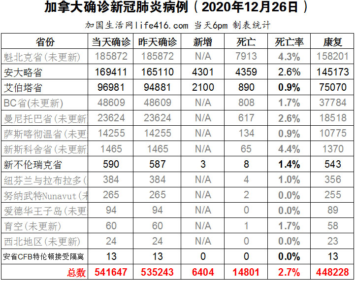 【加国生活网编译报道】截至12月26日下午6点,加拿大新冠确诊病例总数为541647(两天新增6404),死亡14801(两天新增81)。安省确诊总数169411(两天新增4301);艾省确诊总数96981(两天新增2100);其余省份因圣诞假期均未更新。“狼终于来了”!安省在12月26日宣布发现了2例英国变异新冠病毒确诊病例;截止到12月26日,只有安省、艾省和新不伦瑞克省更新了疫情最新数据。加国生活网专门制作了如下统计数据表: