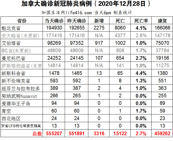 【加国生活网编译报道】截至12月28日下午6点,加拿大新冠确诊病例总数为555207(新增3316),死亡15122(五天新增321)。魁省确诊总数194930(新增2275);艾省确诊总数98269(新增917-较昨天有调整);曼省确诊总数24252(新增107);安省、BC省和萨省均未更新数据。魁省当天死亡人数新增37例,不仅使全省死亡总数达到8060,也使加拿大全国死亡总数超过15000例;艾省新冠死亡总数已迈过1千例“悲剧性里程碑”致1002例,同时艾省宣布发现首例英国变异新冠病毒确诊病例,致使加拿大确诊病例升至5例。加国生活网专门制作了如下统计数据表: