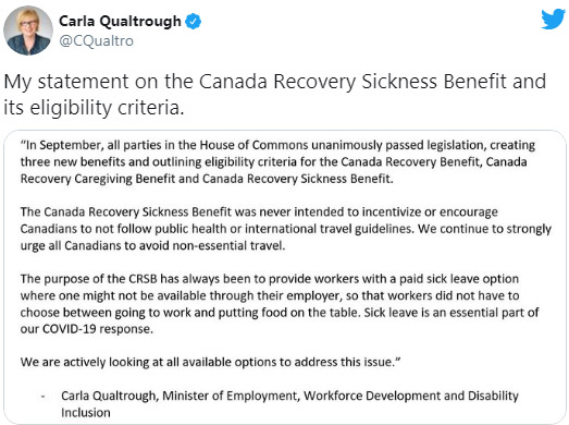 —— 加拿大联邦政府正在“积极寻找”解决加拿大康复福利金(CRSB)漏洞的方案,起因是一些加拿大人出国度假回国后需要强制隔离而必须暂停工作,而他们在隔离期内仍然可以领取CRSB。加拿大就业部长Carla Qualtrough在1月3日发布声明说:“CRSB从未打算激励或鼓励加拿大人不遵守公共卫生或国际旅行准则。我们继续强烈敦促所有加拿大人避免不必要的旅行。发放CRSB的目的是为工人提供带薪病假选项,如果加拿大居民因新冠测试呈阳性或因病毒被隔离而无法在计划工作时间的至少一半时间内不能工作,则可以申请该福利,这其中‘sick leave’是我们应对措施的重要组成部分。”