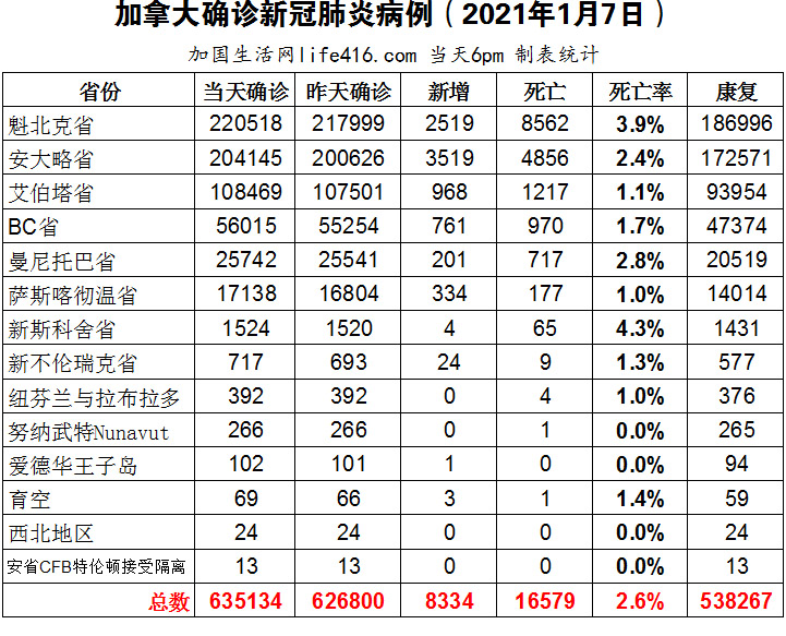 【加国生活网编译报道】截至2021年1月7日下午6点,加拿大新冠确诊病例总数为635134(新增8334),死亡16579(新增210)。魁省确诊总数220518(新增2519);安省确诊总数204145(新增3519);艾省确诊总数108469(新增968);BC省确诊总数56015(新增761);曼省确诊总数25742(新增201);萨省确诊总数17138(新增334)。艾省学校将于1月11日按照政府原计划恢复到校面对面上课;在圣诞假期结束后两周,BC省单日新增确诊病例突然激增至761;安省当天新增3519例确诊病例和89例死亡病例,二项均创自疫情以来最高纪录;安省南部小学的返校日推迟至1月25日。加国生活网专门制作了如下统计数据表: