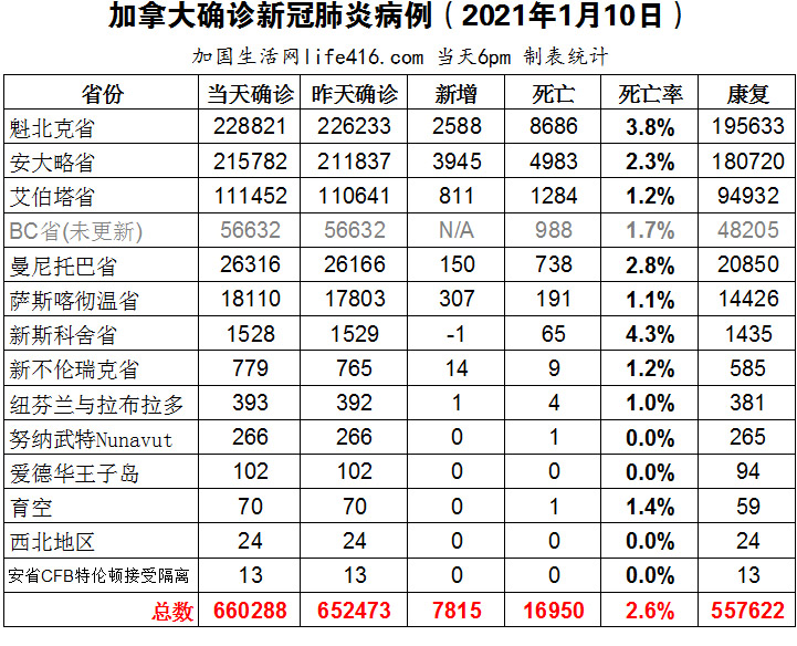【加国生活网编译报道】截至2021年1月10日下午6点,加拿大新冠确诊病例总数为660288(新增7815),死亡16950(新增117)。魁省确诊总数228821(新增2588);安省确诊总数215782(新增3945);艾省确诊总数111452(新增811);BC省逢周末不更新;曼省确诊总数26316(新增150);萨省确诊总数18110(新增307)。加拿大无需批准其他疫苗也能在9月之前为3千万加拿大人接种新冠疫苗;安省连续第7天超过3千例,当天死亡的61人中,有21个人是长期护理系统居民;新斯科舍省当天没有新增确诊病例,是自去年11月以来首次报告零新增病例。加国生活网专门制作了如下统计数据表: