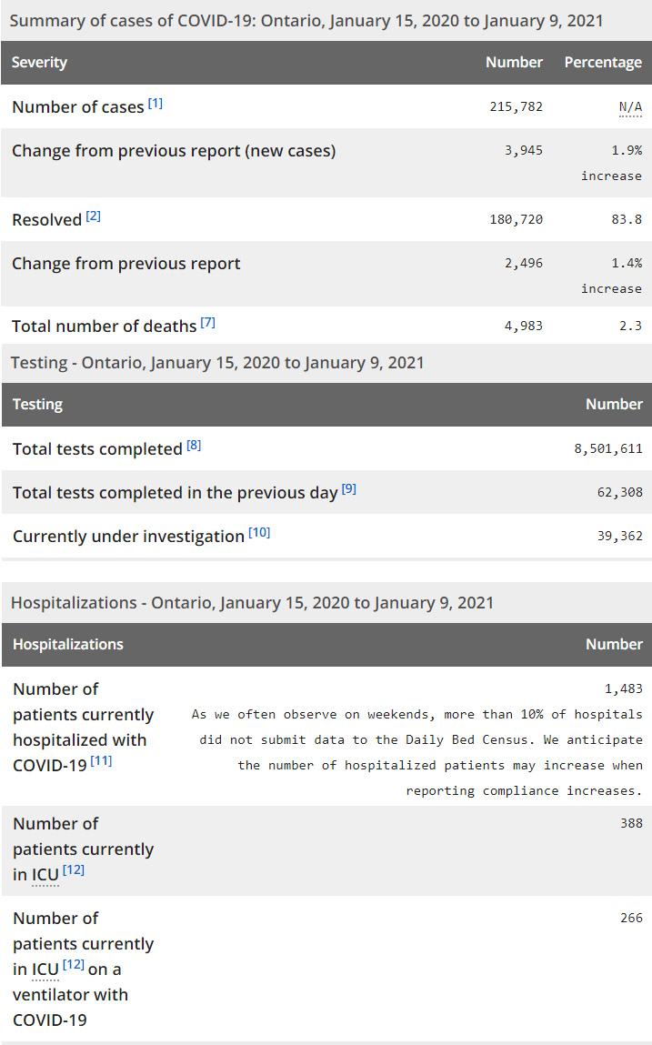 再看看安省方面的详细数据,截止1月9日,安省已对8,501,611例进行了新冠病毒检测(检测数较昨天新增62,308),还有39,362处于被调查阶段。确诊总数215,782(较昨天新增3945,确诊率上升至6.33%),包括180,720例康复(康复率下降至83.8%)、4983例死亡(增加61例,死亡率仍为2.3%)。住院患者1483例(增加26);进入ICU患者388例(增加6);IU插呼吸机患者266例(增加22)。