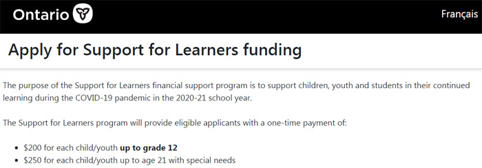—— 安省曾在2020年11月30日宣布了一项在疫情期间申请的“支持学生计划”的福利金(Support for Learners funding),父母们可在2020年11月30日至2021年1月15日在线申领补助金用于2020-2021学年的费用,无论是公校或私校,还是在校学习或在家上网课的学生,都有资格申请。每个家庭可以为每个12岁以下的孩子申请$200,或为21岁以下有特殊需要的青少年申请$250。