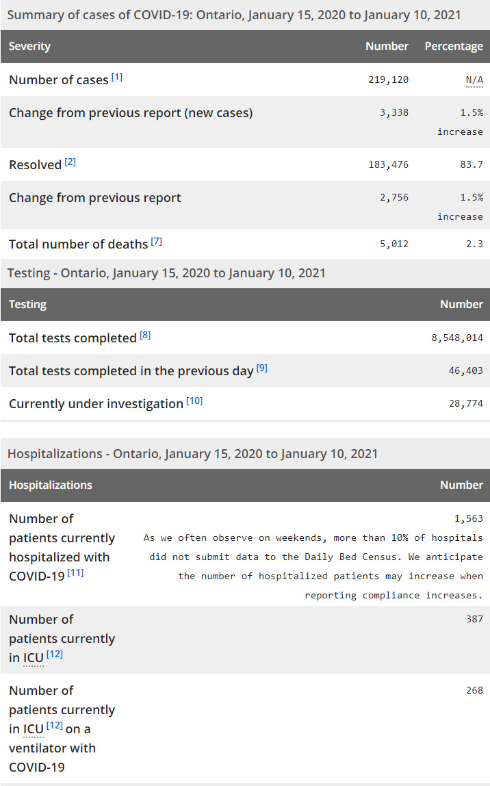 再看看安省方面的详细数据,截止1月10日,安省已对8,548,014例进行了新冠病毒检测(检测数较昨天新增46,403),还有28,774处于被调查阶段。确诊总数219,120(较昨天新增3338,确诊率上升至7.19%),包括183,476例康复(康复率下降至83.7%)、5012例死亡(增加29例,死亡率仍为2.3%)。住院患者1563例(增加80);进入ICU患者387例(减少1);IU插呼吸机患者268例(增加2)。