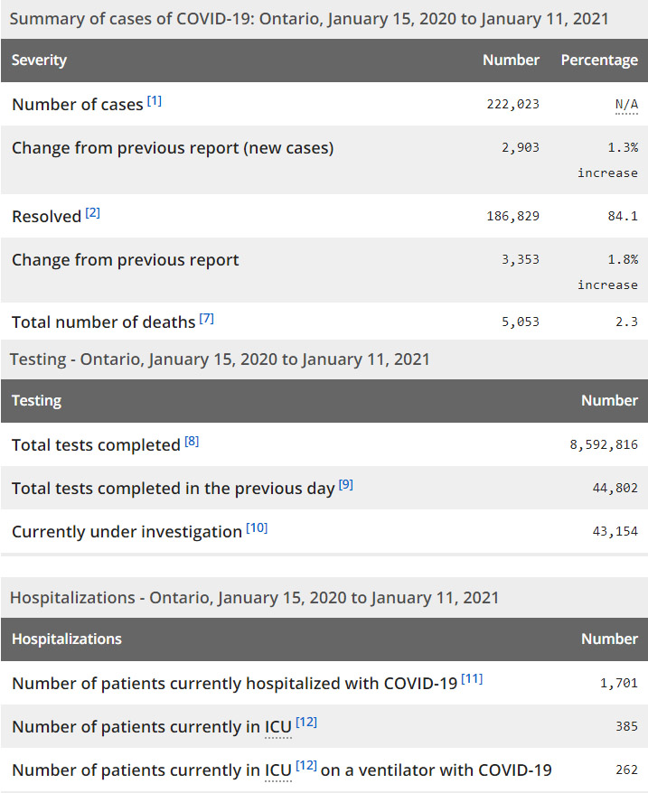 再看看安省方面的详细数据,截止1月11日,安省已对8,592,816例进行了新冠病毒检测(检测数较昨天新增44,802),还有43,154处于被调查阶段。确诊总数222,023(较昨天新增2903,确诊率下降至6.48%),包括186,829例康复(康复率上升至84.1%)、5053例死亡(增加41例,死亡率仍为2.3%)。住院患者1701例(增加138);进入ICU患者385例(减少2);IU插呼吸机患者262例(减少6)。