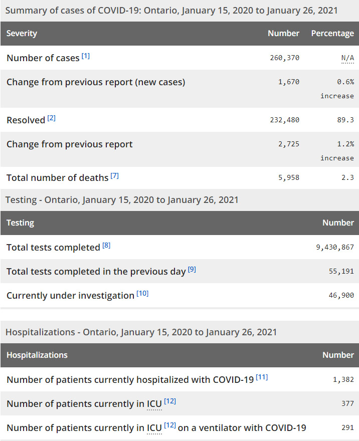 再看看安省方面的详细数据,截止1月26日,安省已对9,430,867例进行了新冠病毒检测(检测数较昨天新增55,191),还有46,900处于被调查阶段。确诊总数260,370(较昨天新增1,670,确诊率下降至3.03%),包括232,480例康复(康复率上升至89.3%)、5,958例死亡(增加49例,死亡率仍为2.3%)。住院患者1382例(减少84);进入ICU患者377例(减少6);IU插呼吸机患者291例(减少7)。