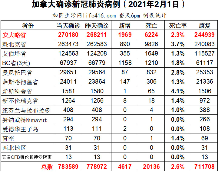 【加国生活网编译报道】截至2021年2月1日下午6点,加拿大新冠确诊病例总数为783589(3天新增4617,当天新增3736),死亡20136(3天新增104)。安省确诊总数270180(新增1969);魁省确诊总数263473(新增890);艾省确诊总数124563(新增355);BC省确诊总数67937(3天新增1158,当天新增277);曼省确诊总数29651(新增87);萨省确诊总数24011(新增147)。BC省新增277例自去年10月以来的单日最低新增病例;魁省新增890例,创自去年11月以来的单日最低新增病例;安省确诊首例南非变异新冠病毒,患者没有旅行史,也没有与外地人接触。加国生活网专门制作了如下统计数据表: