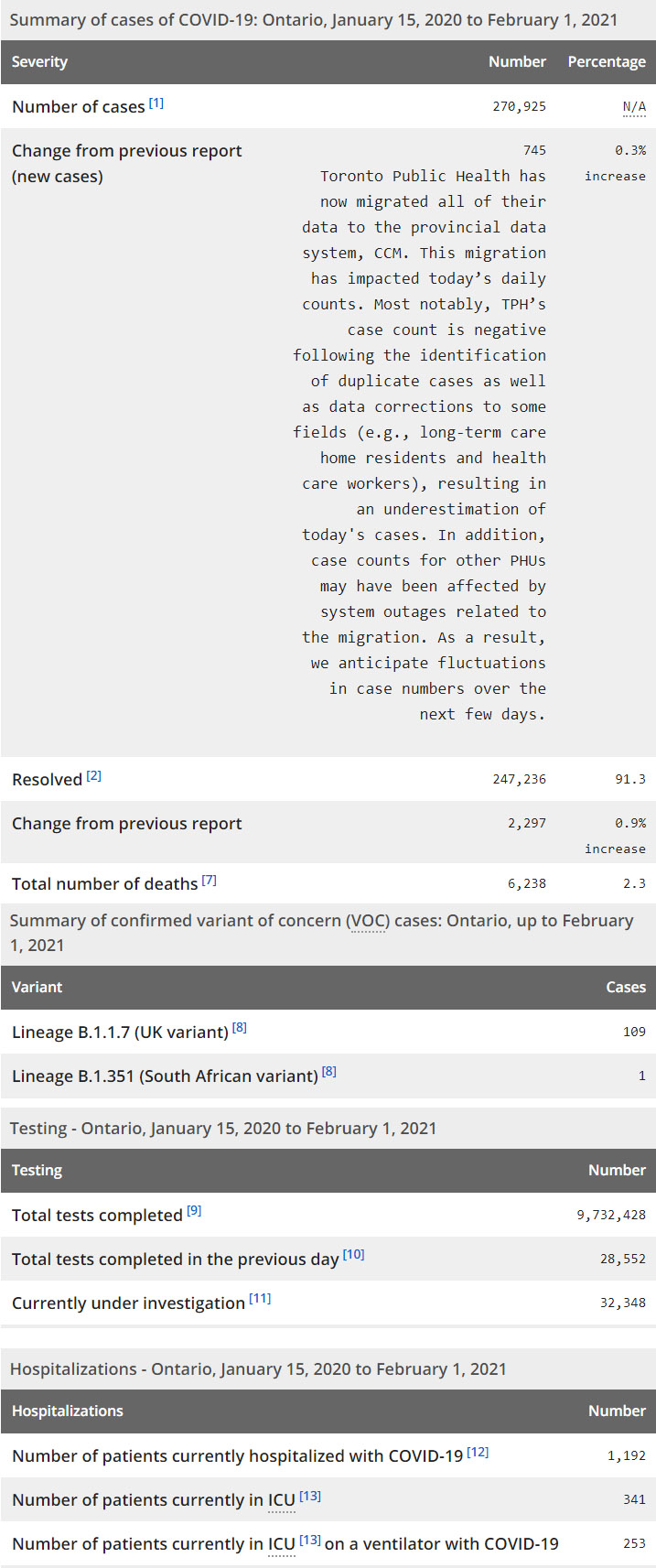再看看安省方面的详细数据,截止2月1日,安省已对9,732,428例进行了新冠病毒检测(检测数较昨天新增28,552),还有32,348处于被调查阶段。确诊总数270,925(较昨天新增745,多伦多公共卫生部门现已将所有数据迁移到省级数据系统CCM,这次迁移已影响到今天的每日新增数据,今天的病例被低估了,预计接下来几天的病例数会有所波动。),包括247,236例康复(康复率上升至91.3%)、6,238例死亡(增加14例,死亡率仍为2.3%)。住院患者1192例(增加34);进入ICU患者341例(减少13);IU插呼吸机患者253例(减少7)。