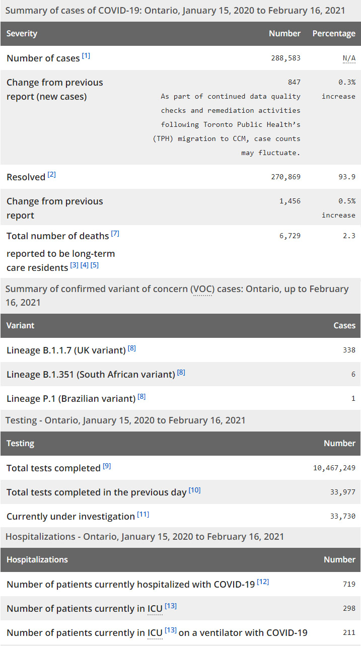 再看看安省方面的详细数据,截止2月16日,安省已对10,467,249例进行了新冠病毒检测(检测数较昨天新增33,977),还有33,730处于被调查阶段。确诊总数288,583(当天新增847,阳性率下降为2.49%。多伦多公共卫生部(TPH)数据库迁移到安省卫生部数据库CCM之后,作为持续的数据质量检查和补救活动的一部分,病例数可能会有所波动),包括270,869例康复(康复率上升至93.9%)、6,729例死亡(增加10例,死亡率仍为2.3%)。住院患者719例(减少23);进入ICU患者298例(增加6);IU插呼吸机患者211例(增加10)。