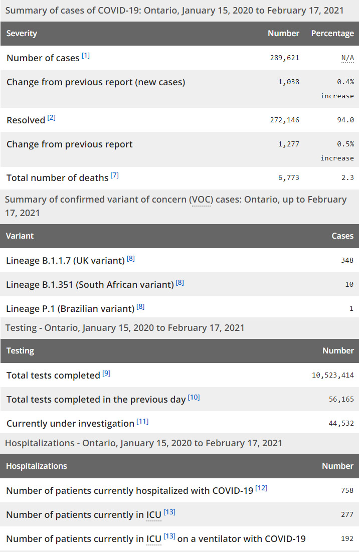 再看看安省方面的详细数据,截止2月17日,安省已对10,523,414例进行了新冠病毒检测(检测数较昨天新增56,165),还有44,532处于被调查阶段。确诊总数289,621(当天新增1038,阳性率下降为1.85%),包括272,146例康复(康复率上升至94%)、6,773例死亡(增加44例,死亡率仍为2.3%)。住院患者758例(增加39);进入ICU患者277例(减少21);IU插呼吸机患者192例(减少19)。