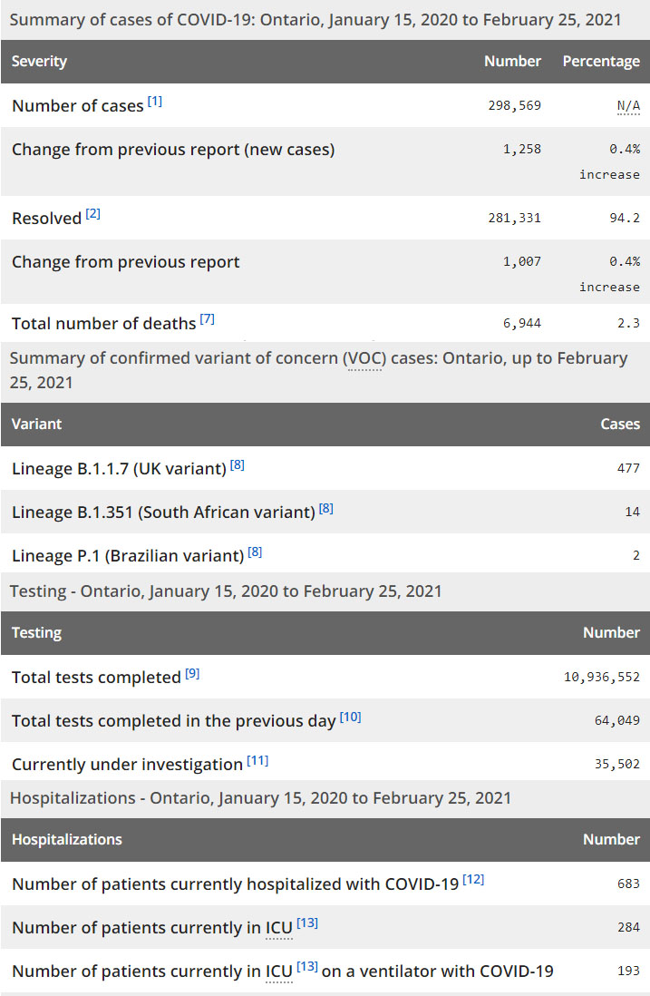再看看安省方面的详细数据,截止2月25日,安省已对10,936,552例进行了新冠病毒检测(检测数较昨天新增64,049),还有35,502处于被调查阶段。确诊总数298,569(当天新增1258,阳性率上升至1.96%),包括281,331例康复(康复率下降为94.2%)、6,944例死亡(增加28例,死亡率仍为2.3%)。住院患者683例(减少4);进入ICU患者284例(增加1);IU插呼吸机患者193例(增加11)。