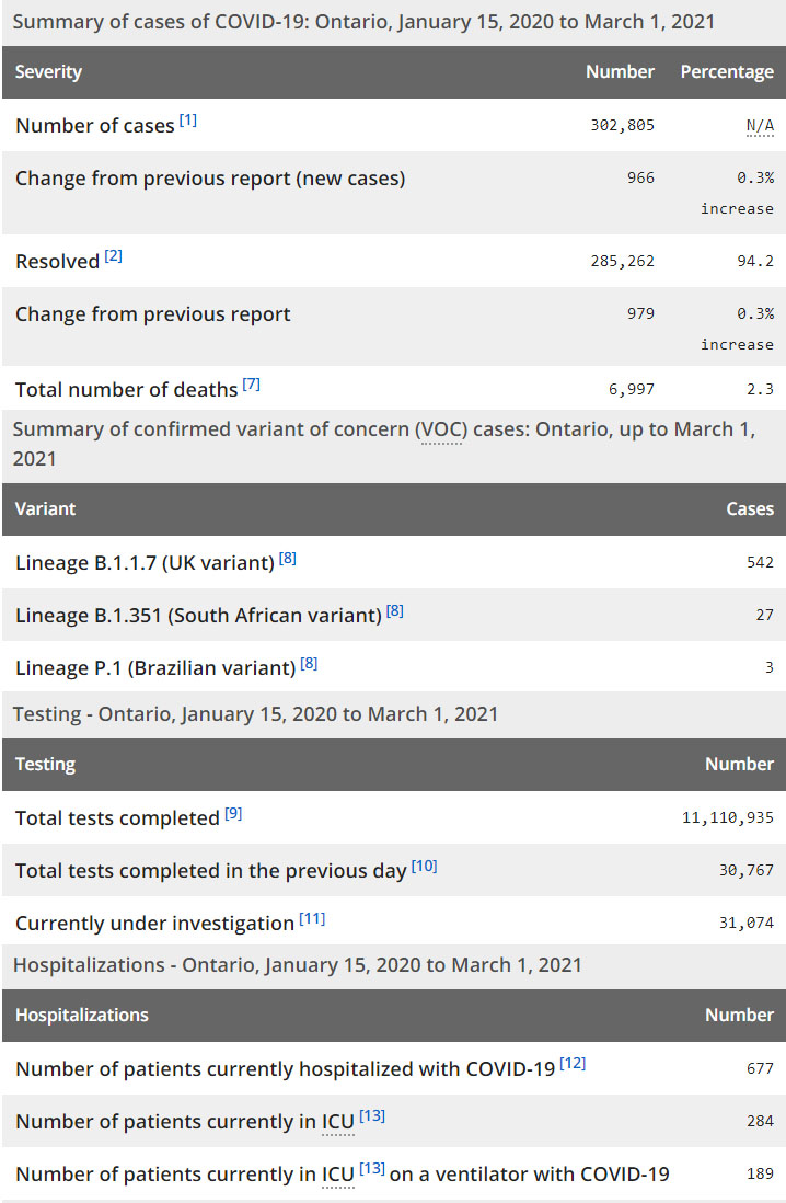 再看看安省方面的详细数据,截止3月1日,安省已对11,110,935例进行了新冠病毒检测(检测数较昨天新增30,767),还有31,074处于被调查阶段。确诊总数302,805(当天新增966,阳性率上升至3.14%),包括285,262例康复(康复率仍为94.2%)、6,997例死亡(增加11例,死亡率仍为2.3%)。住院患者677例(增加18);进入ICU患者284例(增加4);IU插呼吸机患者189例(增加14)。