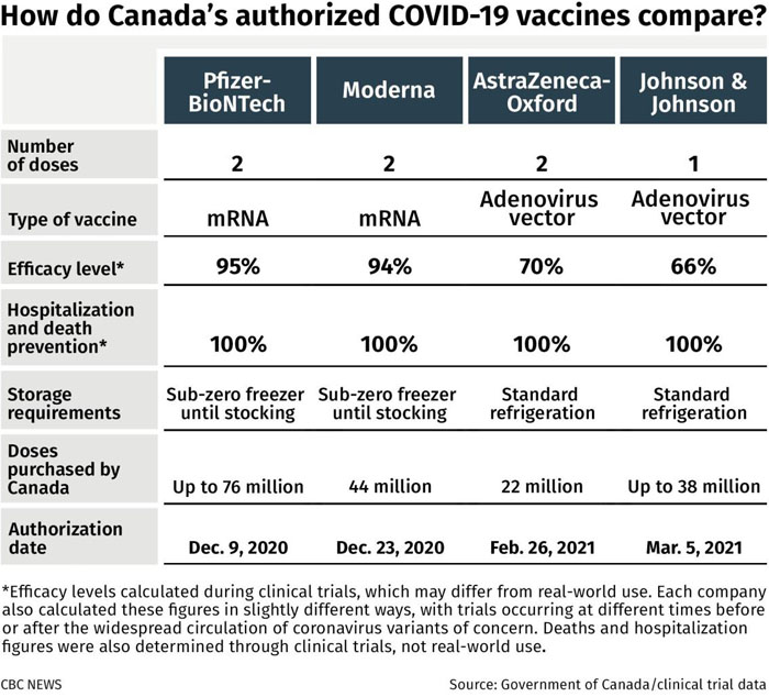 加拿大卫生部表示,强生疫苗在预防中度至重度新冠疾病方面的有效率为66.9%,并已授权将其用于18岁及以上的成年人。尽管该疫苗的功效不及之前批准的辉瑞-BioNTech和Moderna疫苗(后二者的有效率均达到90%以上),但加拿大卫生部首席医学顾问Supriya Sharma博士认为注射疫苗可抵御最重要的威胁:严重疾病、住院和死亡,Supriya Sharma博士说:“有效率并不意味着在接种具有66%功效的疫苗后,您将有34%的机会感染新冠病毒,而是指感染新冠病毒的机率将大大降低,疫苗对变异病毒同样有效。” 加拿大现在预计到6月底将收到3650万剂辉瑞/BioNTech、Moderna、AstraZeneca和强生疫苗。到9月底,加拿大将收到1.179亿剂。