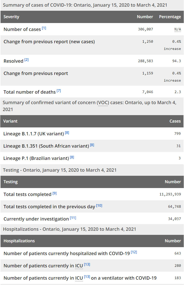 再看看安省方面的详细数据,截止3月4日,安省已对11,293,939例进行了新冠病毒检测(检测数较昨天新增64,748),还有34,037处于被调查阶段。确诊总数306,007(当天新增1250,阳性率上升至1.93%),包括288,583例康复(康复率仍为94.3%)、7,046例死亡(增加22例,死亡率仍为2.3%)。住院患者643例(减少6);进入ICU患者280例(减少1);IU插呼吸机患者183例(未变)。
