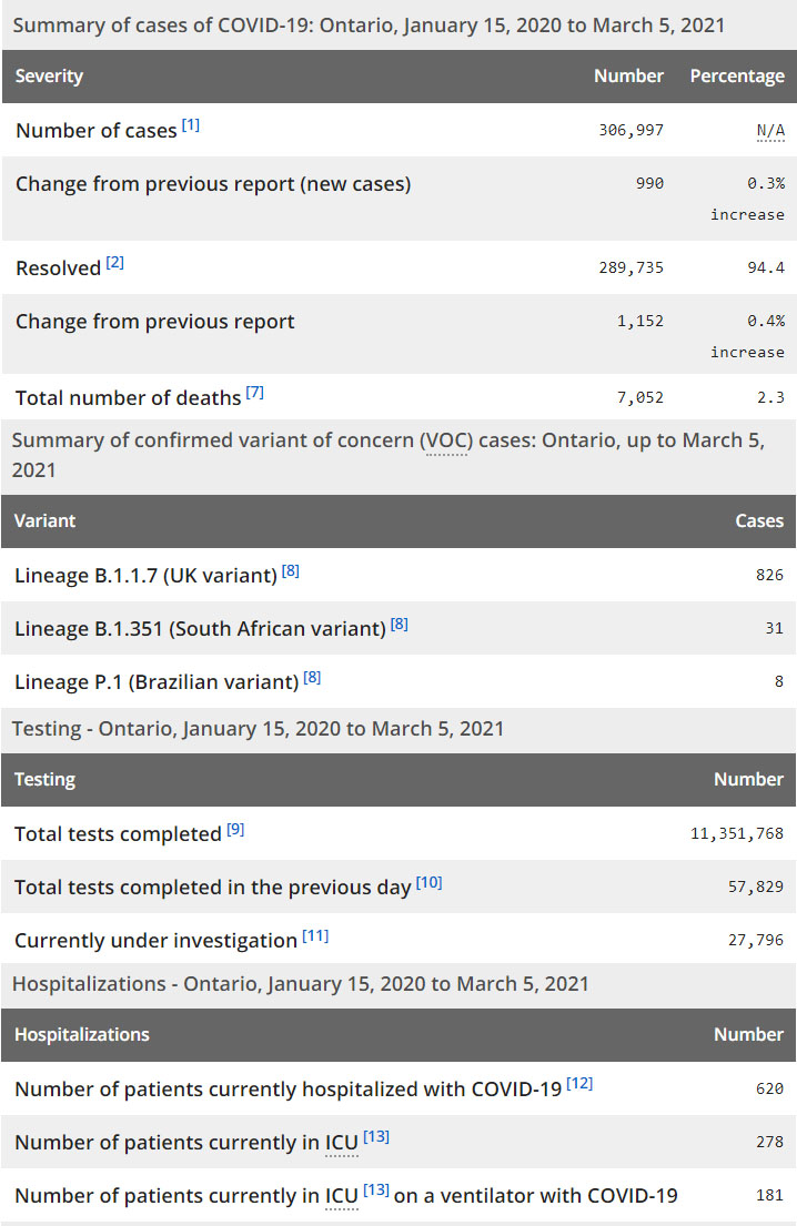再看看安省方面的详细数据,截止3月5日,安省已对11,351,768例进行了新冠病毒检测(检测数较昨天新增57,829),还有27,796处于被调查阶段。确诊总数306,997(当天新增990,阳性率下降至1.71%),包括289,735例康复(康复率上升为94.4%)、7,046例死亡(增加6例,死亡率仍为2.3%)。住院患者620例(减少23);进入ICU患者278例(减少2);IU插呼吸机患者181例(减少2)。