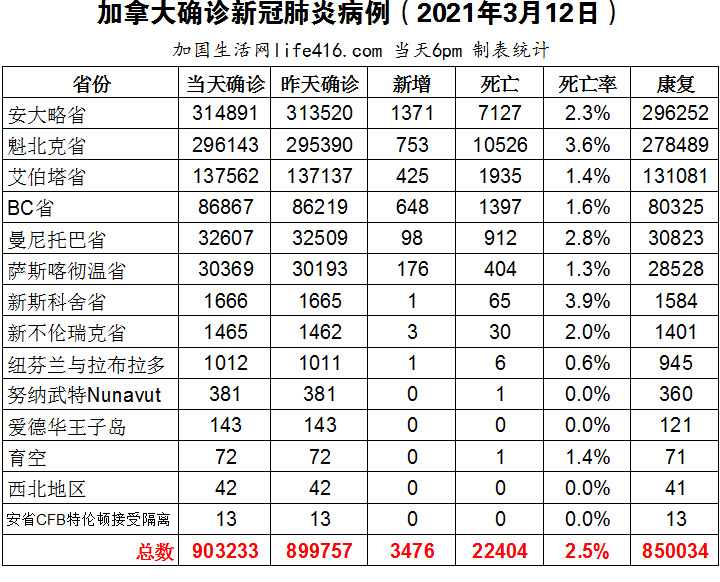 【加国生活网编译报道】截至2021年3月12日下午6点,加拿大新冠确诊病例总数为903233(新增3476),死亡22404(新增33)。安省确诊总数314891(新增1371);魁省确诊总数296143(新增753);艾省确诊总数137562(新增425);BC省确诊总数86867(新增648);曼省确诊总数32607(新增98);萨省确诊总数30369(新增176)。加拿大新冠确诊总数正式迈入90万“里程碑”,变异病毒病例正呈激增势头;加拿大总理特鲁多因担心存在不公平现象,不愿采用“疫苗护照”来证明是否接种了疫苗,但也承认“疫苗护照”对于国际旅行可能是必要的;新冠疫情让加拿大就业率降低了3.1%;安省将从3月15日起将西南的Sarnia-Lambton地区进行锁定。加国生活网专门制作了如下统计数据表: