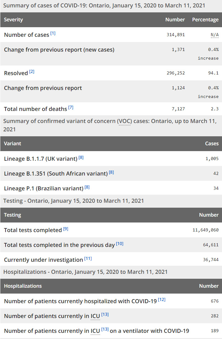再看看安省方面的详细数据,截止3月11日,安省已对11,649,060例进行了新冠病毒检测(检测数较昨天新增64,611),还有36,744处于被调查阶段。确诊总数314,891(当天新增1371,阳性率上升至2.12%),包括296,252例康复(康复率仍为94.1%)、7,127例死亡(增加18例,死亡率仍为2.3%)。住院患者676例(减少4);进入ICU患者282例(增加5);IU插呼吸机患者189例(增加5)。