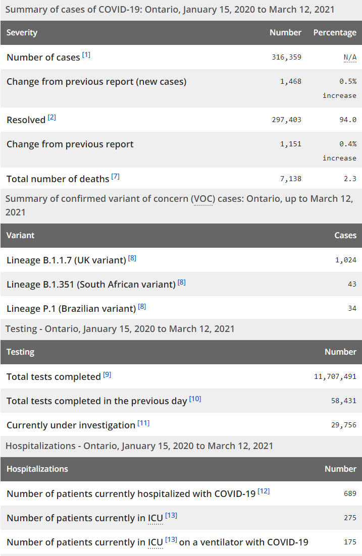 再看看安省方面的详细数据,截止3月12日,安省已对11,707,491例进行了新冠病毒检测(检测数较昨天新增58,431),还有29,756处于被调查阶段。确诊总数316,359(当天新增1468,阳性率上升至2.51%),包括297,403例康复(康复率下降为94.0%)、7,138例死亡(增加11例,死亡率仍为2.3%)。住院患者689例(增加13);进入ICU患者275例(减少7);IU插呼吸机患者175例(减少14)。