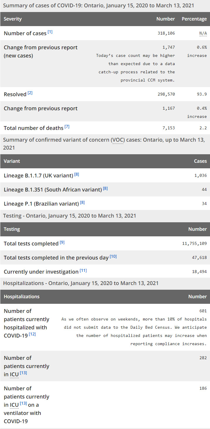 再看看安省方面的详细数据,截止3月13日,安省已对11,755,109例进行了新冠病毒检测(检测数较昨天新增47,618),还有18,494处于被调查阶段。确诊总数318,106(当天新增1747,阳性率上升至3.67%),包括298,570例康复(康复率下降为93.9%)、7,153例死亡(增加15例,死亡率下降为2.2%)。住院患者601例(减少88,有10%医院未能提交数据);进入ICU患者282例(增加7);IU插呼吸机患者186例(增加11)。
