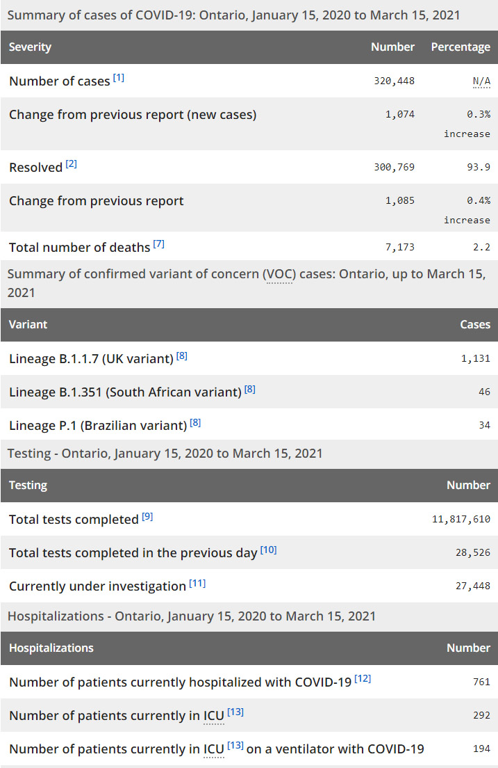 再看看安省方面的详细数据,截止3月15日,安省已对11,817,610例进行了新冠病毒检测(检测数较昨天新增28,526),还有27,448处于被调查阶段。确诊总数320,448(当天新增1074,阳性率上升至3.76%),包括300,769例康复(康复率上升至93.9%)、7,173例死亡(增加11例,死亡率仍为2.2%)。住院患者761例(增加62);进入ICU患者292例(减少6);IU插呼吸机患者194例(增加7)。