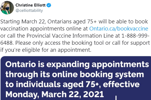 安省卫生部长Christine Elliott发Twitter称,年龄在75岁以上的居民将能够从3月22日开始在线预约接种疫苗。