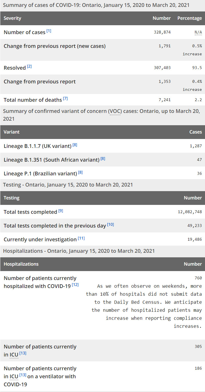 再看看安省方面的详细数据,截止3月20日,安省已对12,082,748例进行了新冠病毒检测(检测数较昨天新增49,233),还有19,486处于被调查阶段。确诊总数328,874(当天新增1791,阳性率上升至3.64%),包括307,403例康复(康复率下降为93.5%)、7,241例死亡(增加18例,死亡率仍为2.2%)。住院患者760例(减少5,10%医院未提交数据);进入ICU患者305例(增加3);IU插呼吸机患者186例(减少3)。