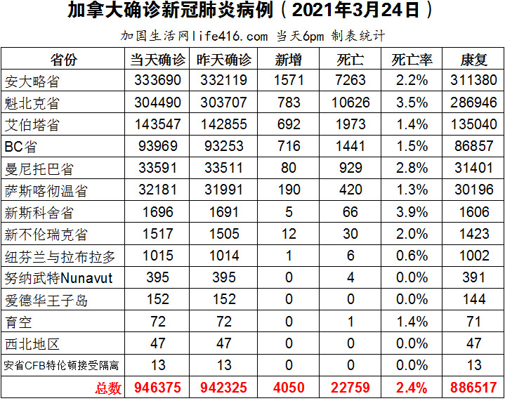 【加国生活网编译报道】截至2021年3月24日下午6点,加拿大新冠确诊病例总数为946375(新增4050),死亡22759(新增24)。安省确诊总数333690(新增1571);魁省确诊总数304490(新增783);艾省确诊总数143547(新增692);BC省确诊总数93969(新增716);曼省确诊总数33591(新增80);萨省确诊总数32181(新增190)。加拿大变异病毒病例已升至6200多例;曼尼托巴省暂停扩大接种疫苗人群的接种资格;安省调整疫苗接种第二阶段计划,部分热点地区的50岁及以上人群被列入第二阶段;安省公布2021财政预算案,331亿赤字要到2029年才能实现收支平衡;多伦多多家医院共有约4千名员工未接种疫苗,其中一个原因是犹豫要不要接种疫苗。加国生活网专门制作了如下统计数据表: