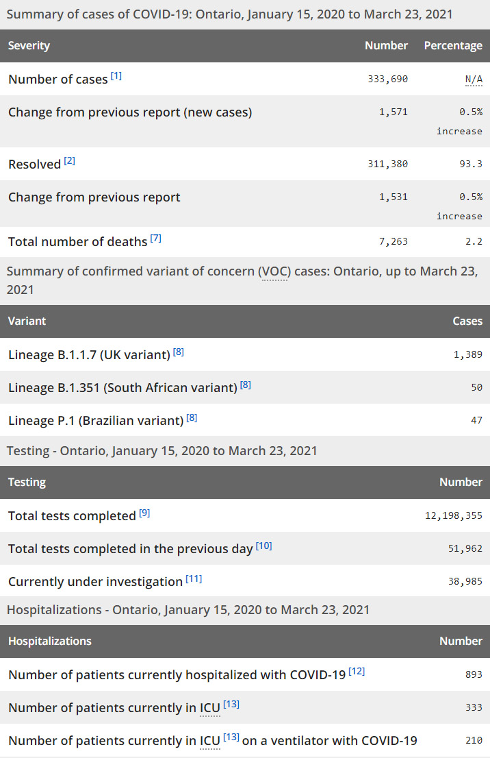 再看看安省方面的详细数据,截止3月23日,安省已对12,198,355例进行了新冠病毒检测(检测数较昨天新增51,962),还有38,985处于被调查阶段。确诊总数333,690(当天新增1571,阳性率下降至3.02%),包括311,380例康复(康复率仍为93.3%)、7,263例死亡(增加10例,死亡率仍为2.2%)。住院患者893例(增加25);进入ICU患者333例(增加9);IU插呼吸机患者210例(增加17)。