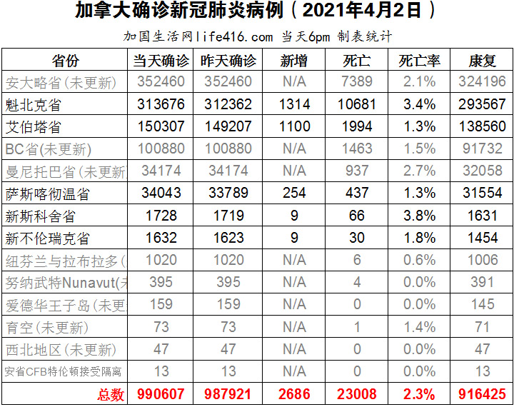 【加国生活网编译报道】截至2021年4月2日下午6点,加拿大新冠确诊病例总数为990607(新增2686),死亡23008(新增6)。4月2日Good Friday,加拿大好多省份没有更新数据,更新数据的省份中:魁省确诊总数313676(新增1314);艾省确诊总数150307(新增1100);萨省确诊总数34043(新增254)。艾省新增1100例确诊病例,创数月以来单日最高记录,艾省儿科医生担心引发“第三波”疫情的变异病毒会让儿童感染率上升;魁省新增1314例确诊病例,连续第三天超过1千例;安省在Good Friday当天未更新数据,省长福特警告省民复活节长周末不要参加任何社交聚会。加国生活网专门制作了如下统计数据表:
