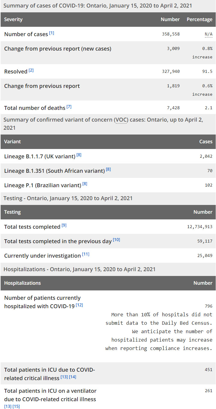 再看看安省方面的详细数据,截止4月2日,安省已对12,734,913例进行了新冠病毒检测(检测数较昨天新增59,117),还有25,049处于被调查阶段。确诊总数358,558(当天新增3009,阳性率上升至5.09%),包括327,940例康复(康复率下降为91.5%)、7,428例死亡(增加39例,死亡率仍为2.1%)。住院患者796例(减少320,有10%医院没有更新数据);进入ICU患者451例(增加18);IU插呼吸机患者261例(增加11)。