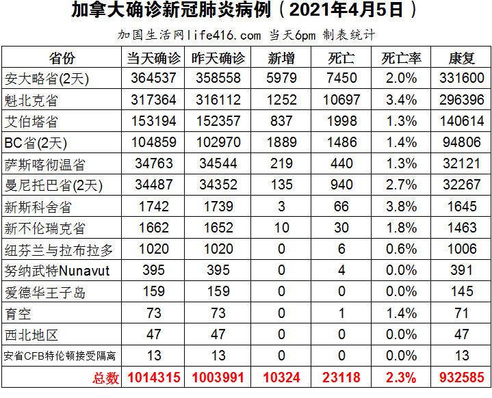 【加国生活网编译报道】截至2021年4月5日下午6点,加拿大新冠确诊病例总数为1014315(2天新增10324,当天新增6217),死亡23118(2天新增67)。安省确诊总数364537(2天新增5979,当天新增2938);魁省确诊总数317364(新增1252);艾省确诊总数153194(新增837);BC省确诊总数104859(2天新增1889,当天新增890);萨省确诊总数34763(新增219);曼省确诊总数34487(2天新增135)。安省两天新增近6千例确诊病例,7天滚动平均值提高一个月前的两倍;皮尔区卫生部发布命令要求布兰普顿、卡里登和密西沙加这三个地区的学校关闭两个星期;多伦多、皮尔区和渥太华三地卫生官敦促安省立即采取更强有力的全省“居家令”措施;多伦多正准备制定一项疫苗计划,不考虑年龄限制为高风险人群在他们的工作地点接种疫苗。加国生活网专门制作了如下统计数据表: