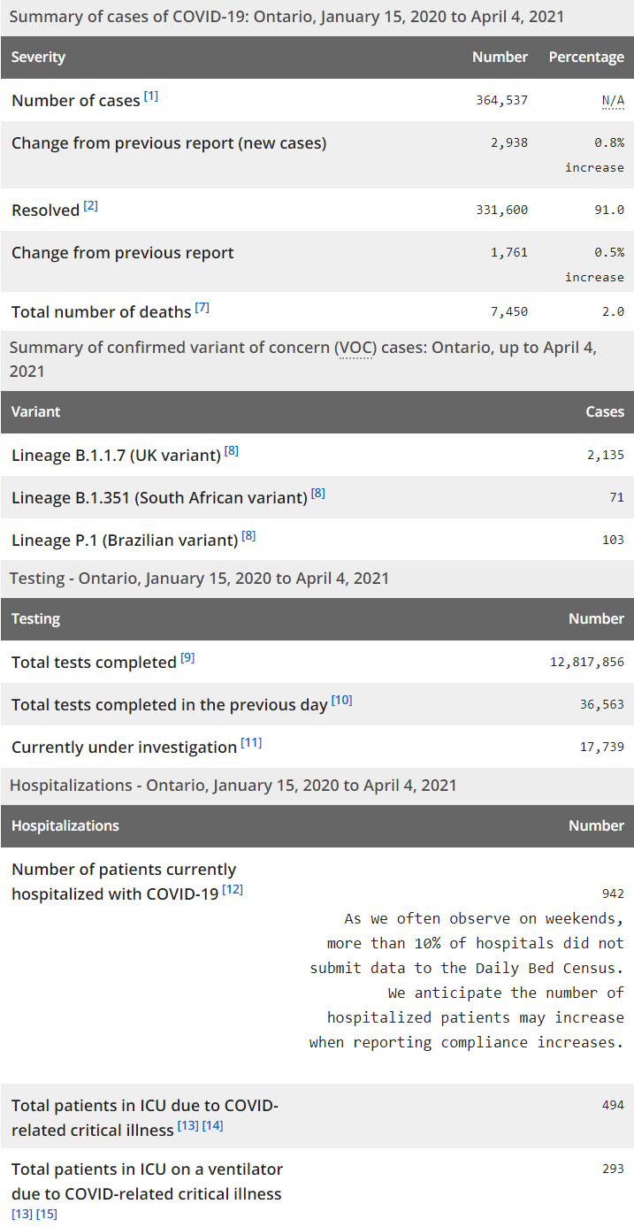 再看看安省方面的详细数据,截止4月4日,安省已对12,817,856例进行了新冠病毒检测(检测数较昨天新增36,563),还有17,739处于被调查阶段。确诊总数364,537(当天新增2938,阳性率上升至8.04%),包括331,600例康复(康复率下降为91.0%)、7,450例死亡(增加22例,死亡率下降为2.0%)。住院患者942例(增加146,有10%医院没有更新数据);进入ICU患者494例(增加43);IU插呼吸机患者293例(增加32)。