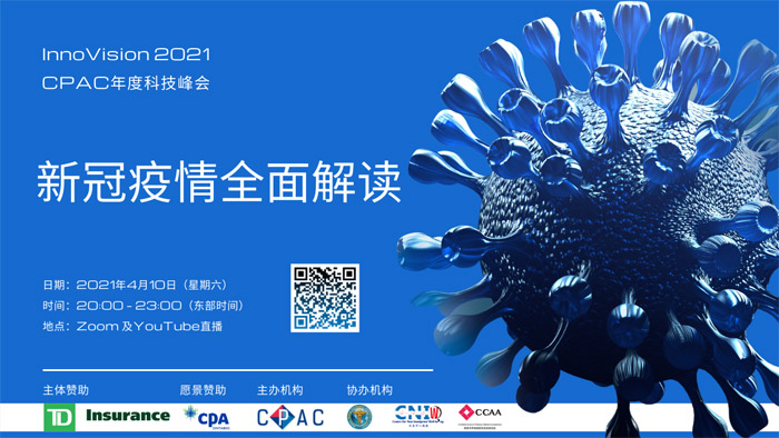 —— 好消息:加拿大中国专业人士协会(CPAC)以“新冠疫情全面解读”为主题的2021年度科技峰会(InnoVision Summit)即将于2021年4月10日(星期六)晚在线上举办。鉴于新冠病毒自2020年初开始在全球持续蔓延,给世界范围内公共卫生系统和整个人类生活带来巨大挑战,CPAC 2021年度科技峰会将以特别版的形式聚焦新冠这一专题,邀请该领域加拿大顶尖的华裔专家,专门用中文为全加华人做一场针对新冠病毒、疫苗和检测解读等方面的全面、深入的系统讲解,包括三个专题:全面解读新冠肺炎、新冠疫苗详解、核酸检测及抗体检测的解读,机会难得,不要错过。详情请点击这里《CPAC年度科技峰会4月10日举行 邀顶尖专家全面解读新冠疫情疫苗》