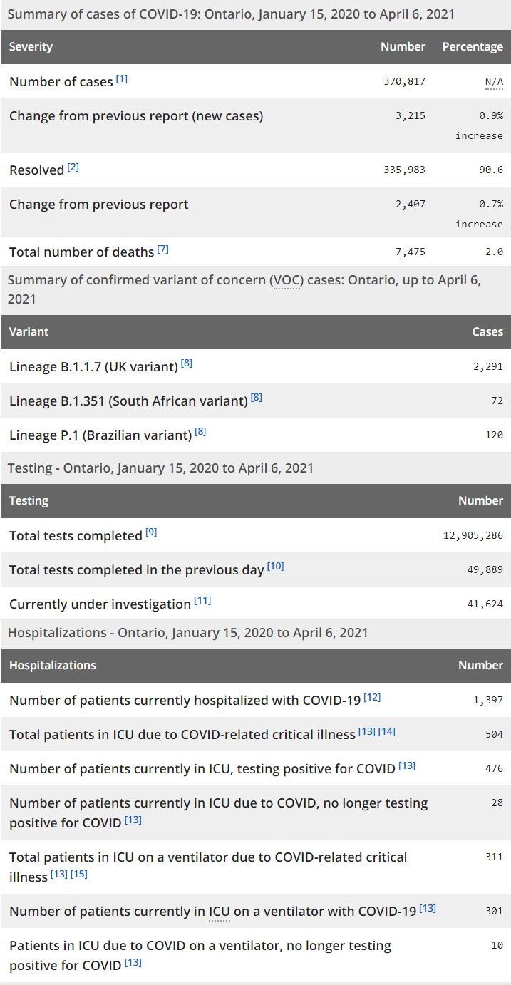 再看看安省方面的详细数据,截止4月6日,安省已对12,905,286例进行了新冠病毒检测(检测数较昨天新增49,889),还有41,624处于被调查阶段。确诊总数370,817(当天新增3215,阳性率下降至6.44%),包括335,983例康复(康复率下降为90.6%)、7,475例死亡(增加17例,死亡率仍为2.0%)。住院患者1397例(增加236);进入ICU患者476例(减少34);IU插呼吸机患者311例(增加1)。
