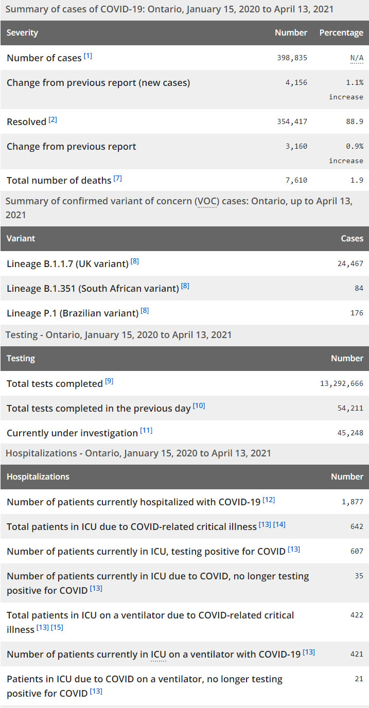 再看看安省方面的详细数据,截止4月13日,安省已对13,292,666例进行了新冠病毒检测(检测数较昨天新增54,211),还有45,248处于被调查阶段。确诊总数398,835(当天新增4156,阳性率下降至7.67%),包括354,417例康复(康复率下降为88.9%)、7,610例死亡(增加28例,死亡率仍为1.9%)。住院患者1877例(增加55);进入ICU患者642例(增加16);IU插呼吸机患者422例(未变)。